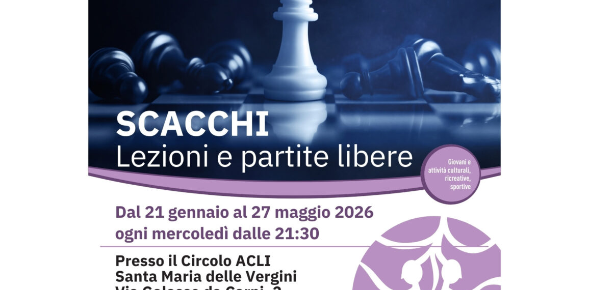 Ogni mercoledì sera a Macerata si svolge un appuntamento dedicato agli scacchi, con incontri che uniscono momenti di lezione e partite libere. L’iniziativa prosegue fino al 27 maggio e prende il via alle 21.30 presso il Circolo Acli Santa Maria delle Vergini, situato in via Galasso da Carpi 2. L’attività è promossa dall’U.S. Acli Marche Aps, dall’U.S. Acli provinciale di Macerata Aps e dall’A.S.D. Centro Iniziative Giovani Aps, realtà che hanno avviato il progetto nell’aprile 2025. La conduzione degli incontri è affidata all’istruttore Dante Guglielmi e l’invito è rivolto sia a chi conosce già il gioco e desidera migliorare tecnica e strategia, sia a chi non ha alcuna esperienza e vuole imparare dalle basi. La partecipazione non prevede costi e per ricevere informazioni o iscriversi è possibile inviare un messaggio al 3495711408. Le attività rientrano nel progetto “R.A.D.I.C.I. Rete Attiva per il Domani: Insieme per una Comunità Integrata”, sostenuto dalla Regione Marche attraverso fondi statali del Ministero del Lavoro e delle Politiche Sociali. La pratica costante degli scacchi offre numerosi benefici, tra cui un miglioramento della capacità di concentrazione e della memoria, lo sviluppo del pensiero logico e della capacità di pianificazione, una maggiore abilità nel prendere decisioni ponderate, l’abitudine a valutare alternative e conseguenze e un potenziamento della creatività grazie alla ricerca continua di soluzioni nuove ed efficaci.