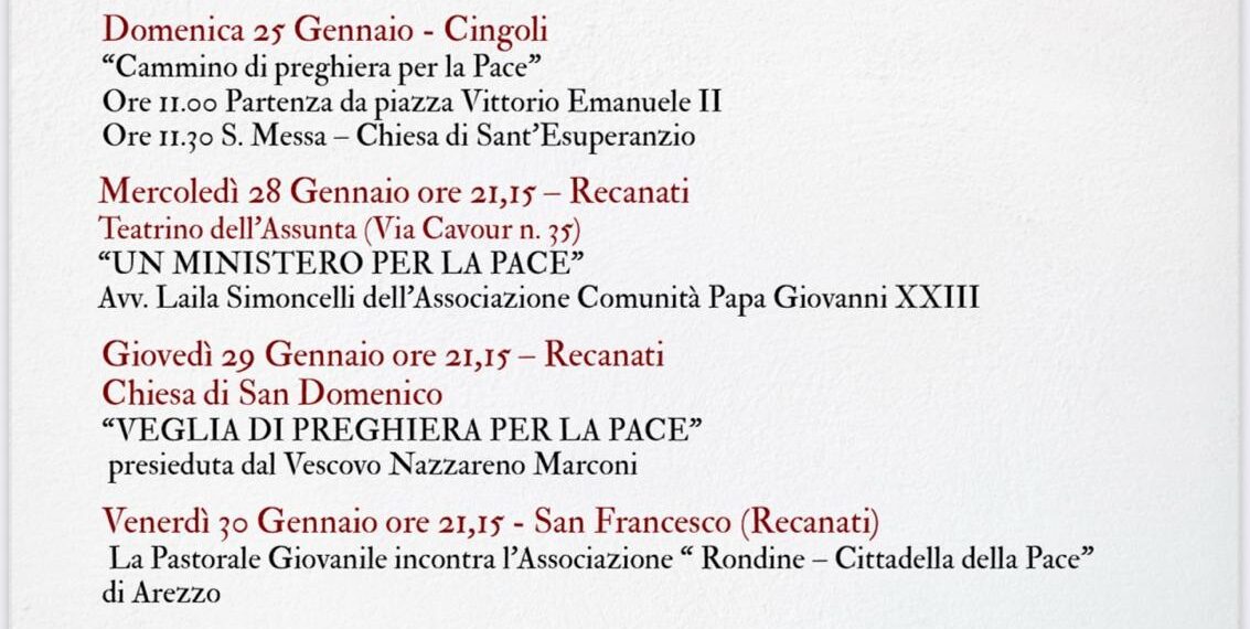 Un “Cammino di preghiera per la pace “inizierà domenica 25 gennaio a Cingoli alle ore11.